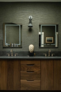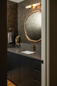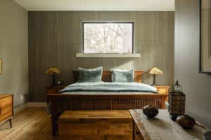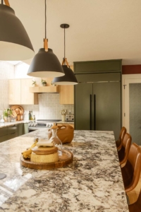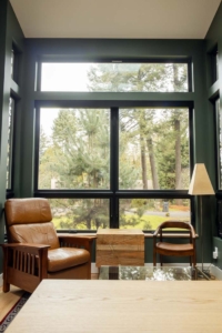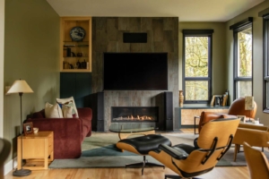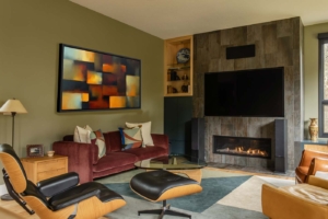 Vaulting the ceilings in the entry and office opened the home up immediately, creating a natural flow from the front door into the main living space and the views beyond. Throughout the interior, greens and earthy tones tie the rooms to the forest outside. The kitchen was fully remodeled with green cabinetry, a custom-paneled refrigerator, and custom-designed routed cabinet pulls. A bold red accent wall creates contrast with the kitchen and ties into the maroon sofa in the living room, weaving a cohesive color story through the main living area.