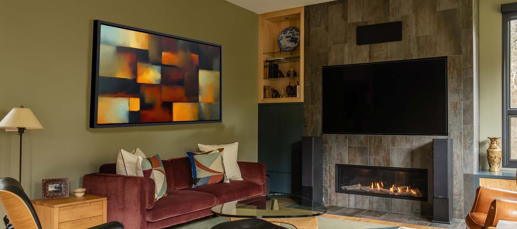A recessed television and custom built-ins bring function and visual balance to the living room’s centerpiece.