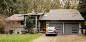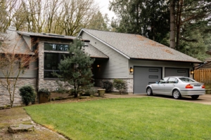 Metal roof accents, new garage doors, cultured stonework, and double front doors with rain glass and natural wood create a warm, modern entry.