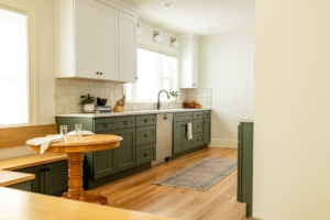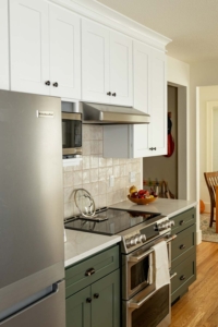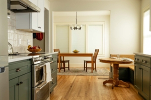 A built-in dining nook creates a comfortable gathering spot for the family, while concealed storage and a compact pantry keep the space organized. Warm finishes—green cabinetry and patterned tile—bring texture and personality to the remodel.