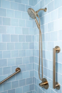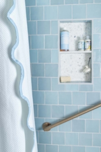 The client wanted a bathroom that felt like a natural extension of her earlier kitchen remodel—fresh and current, yet rooted in the home’s original character. A handcrafted blue tile with subtle variation brings serenity and texture to the walls, while terrazzo flooring adds a playful note that carries into the shower niche.