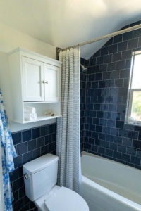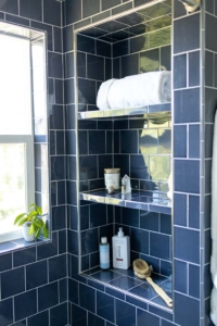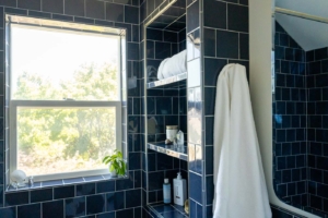 Upstairs, a dated bathroom was reimagined for a young family. The new design maximizes storage and functionality while bold tile selections add character and a sense of permanence—a space that feels timeless yet unmistakably original.