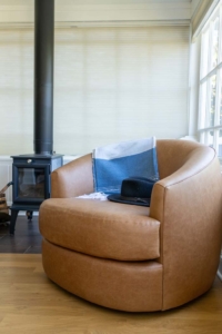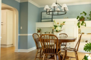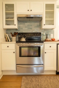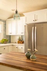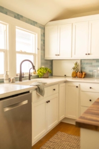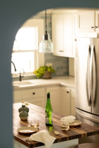 The homeowners wanted to brighten their kitchen and strengthen its connection to the dining room—all while preserving the charm of their older bungalow. A widened entry with softly curved edges now echoes the home’s original archways, while airy blues in the backsplash and wallcoverings bring light and continuity to both rooms. Health-conscious material choices, including zero-VOC paints and ceramic tile, were central to the design.