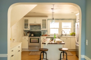 A new arched opening mirrors the home’s original details and improves flow to the dining room.
