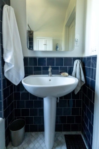 Soft blue tile and wallcoverings bring brightness and visual continuity across spaces.
